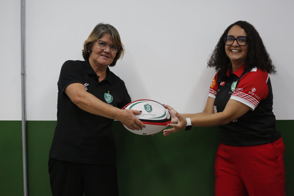 Regina Costa passa bola para Jessica Bernardino em eleição do Jacareí Rugby – Foto: Ícaro Leal/Jacareí Rugby