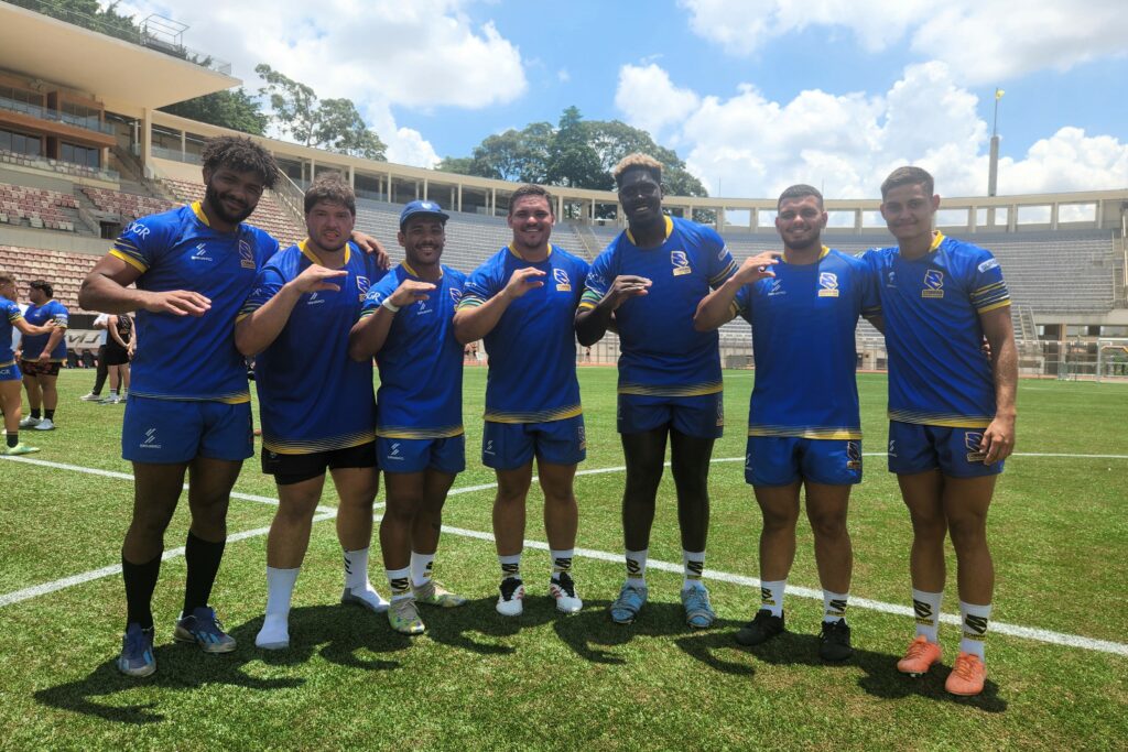 Da direita para a esquerda – Matheus Augusto, Nicolas Alkmin, Maiki Lemes, João Lucas Marino, Gabriel Oliveira, João Arraez e Nicolas Azevedo (Foto: Icaro Leal/Jacareí Rugby)